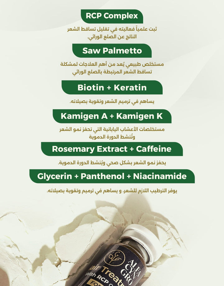 - Procapil , Redensyl , Capixyl , Saw Palmetto Extract , RosemaryExtract , Cafeine , Aكامجين , Kكامجين , Biotin , Keratin , Panthenol , Niacinamide