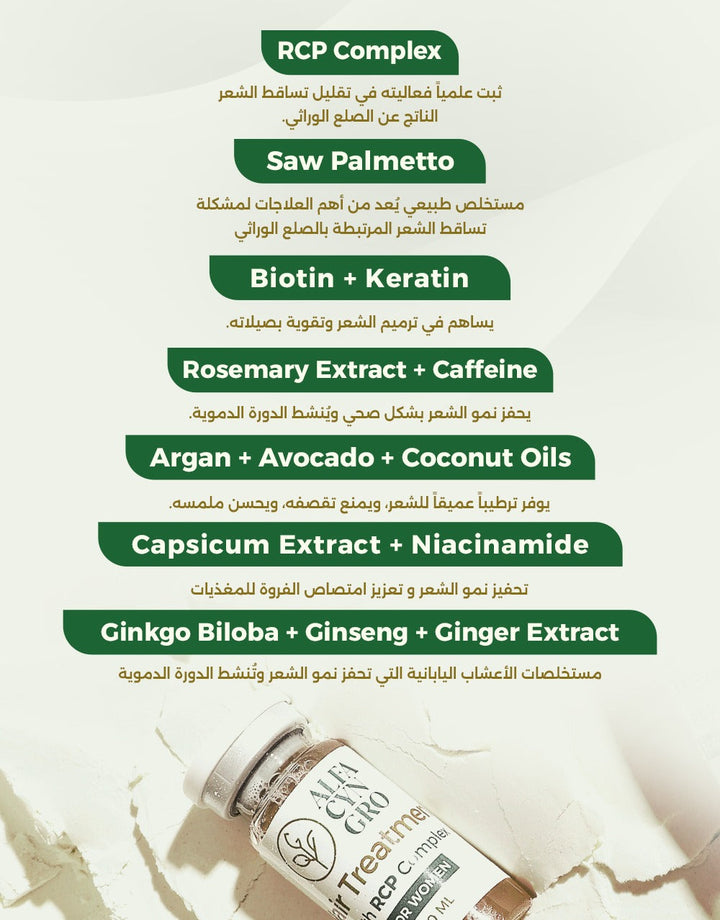 - Procapil , Redensyl , Capixyl , Saw Palmetto Extract , RosemaryExtract , Cafeine , Biotin , Keratin , Panthenol , Niacinamide , Ginseng , Frankincense , GinkgoBiloba , ArganOil , AvocadoOil , CoconutOil , Capsicum Extract